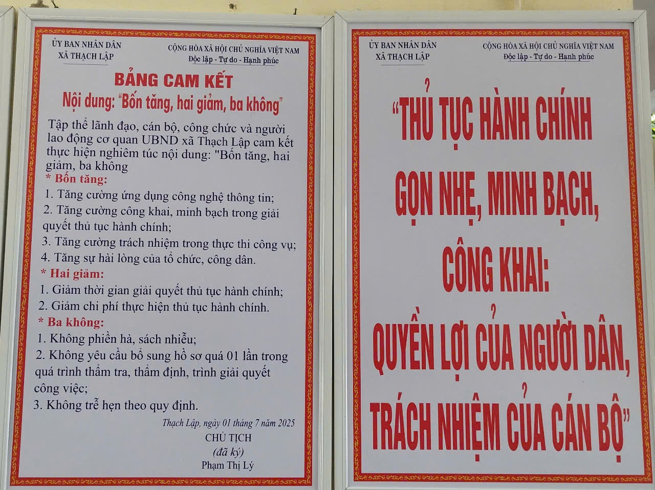 Sau khi sáp nhập,ngay từ những ngày đầu Trung tâm phục vụ hành chính công xã Thạch Lập đã được kiện toàn cả về cơ sở vật chất lẫn nhân lực, áp dụng công nghệ số để phục vụ người dân thuận tiện hơn,giúp người dân chỉ cần đến một địa điểm để nộp hồ sơ, theo dõi, nhận kết quả. Với phương châm "THỦ TỤC HÀNH CHÍNH GỌN NHẸ, MINH BẠCH, CÔNG KHAI : QUYỀN LỢI CỦA NGƯỜI DÂN,TRÁCH NHIỆM CỦA CÁN BỘ ". Hệ thống phần mềm hành chính công kết nối liên thông từ xã đến tỉnh, giúp hồ sơ được xử lý nhanh gọn, rõ ràng. Mỗi hồ sơ đều có mã số tra cứu, người dân có thể theo dõi tiến độ xử lý qua mạng.Cam kết với nội dung "Bốn tăng ,hai giảm ,ba không"